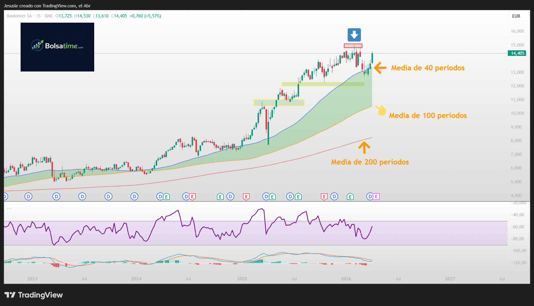 Resistencias: Por arriba, nos vamos a fijar en primer lugar hacia la zona de los 14,55 € . Si vuelve hacia ella para situarse por encima, nos indicaría fuerza de nuevo en la recuperación actual y y debería mirar hacia el nivel de los 14,99 € como siguiente objetivo. Ese es muy importante sobre Bankinter, ya que vamos a tener los máximos marcados en el pasado mes de febrero de este año 2026. Por lo tanto, tendremos que ver muy bien que hace a su visita.
