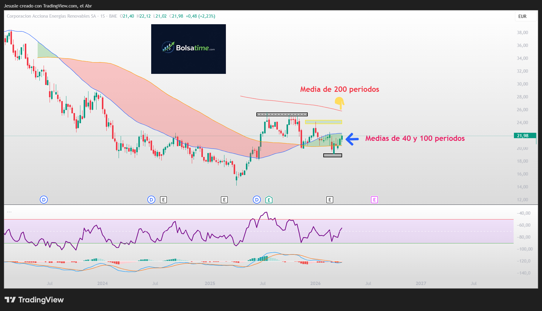 Por la parte de arriba, nos vamos a fijar en primer lugar sobre el nivel de los 22,56 €. Si consigue situarse por encima, intentaría dejar atrás la media de 40 períodos y rompería los máximos del pasado mes de febrero de este año 2026.