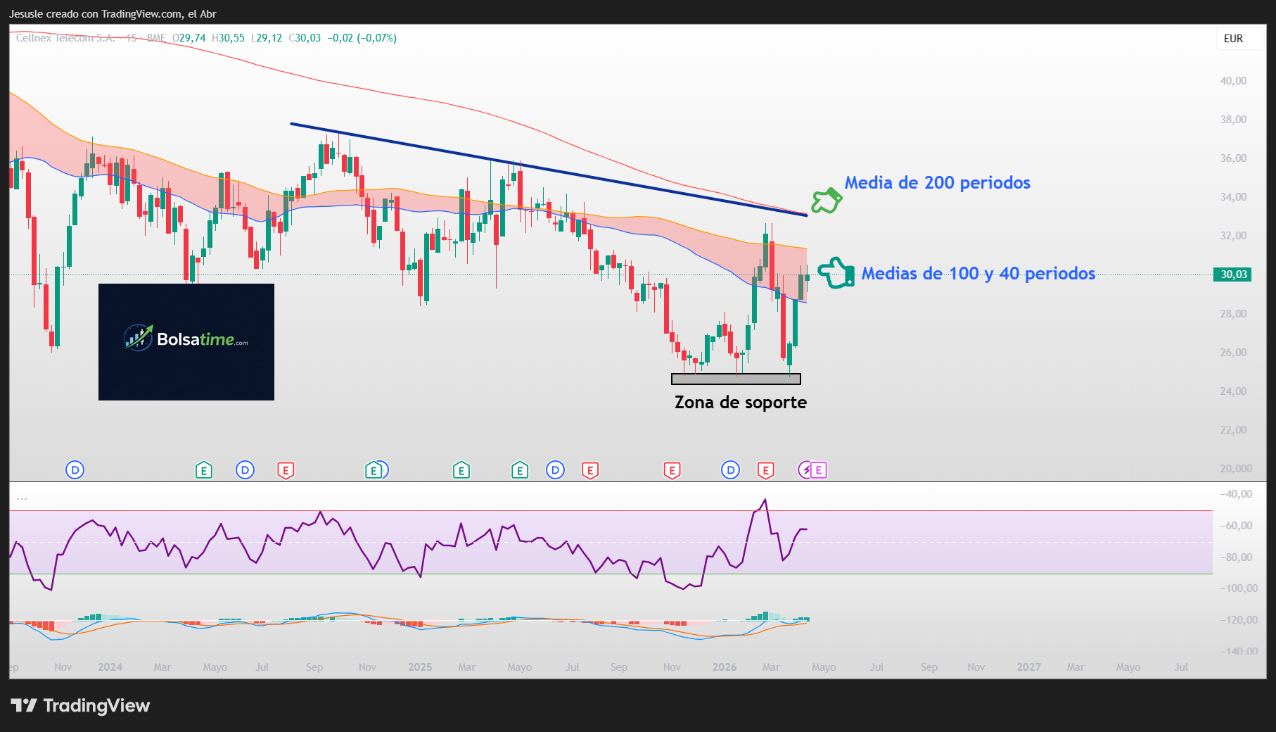 De momento la media de 200 periodos no cambia de situación y sigue por encima de la cotización de Cellnex. Por lo tanto, continua dejando como bajista la tendencia de largo plazo (aunque ojo que cada vez está mas cerca de ella).
