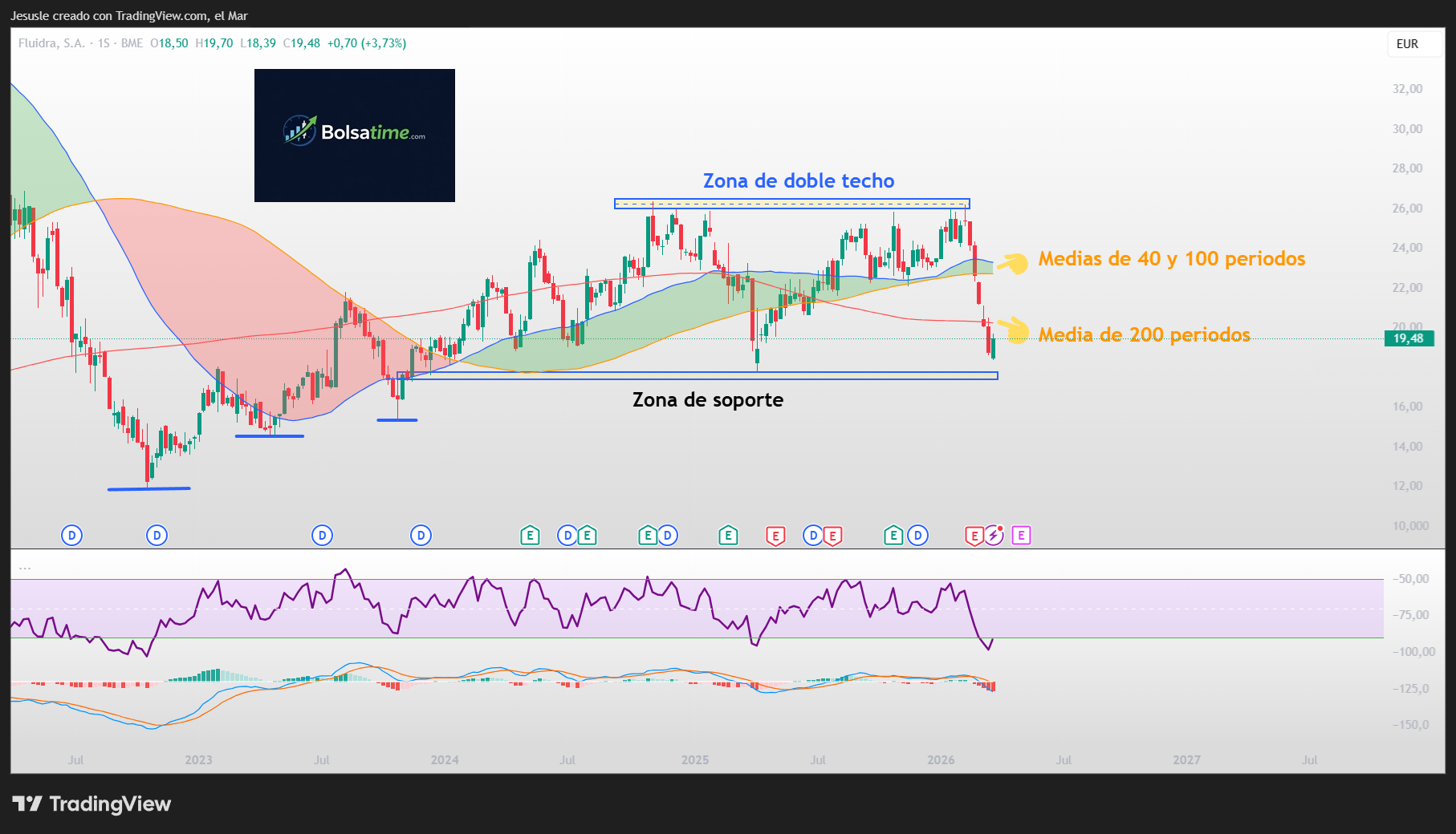 No cambia la situación de las medias de 40, 100 y 200 períodos en gráfico semanal sobre Fluidra y es que siguen por debajo del precio, reafirmando como alcista la tendencia actual en todos los plazos.
