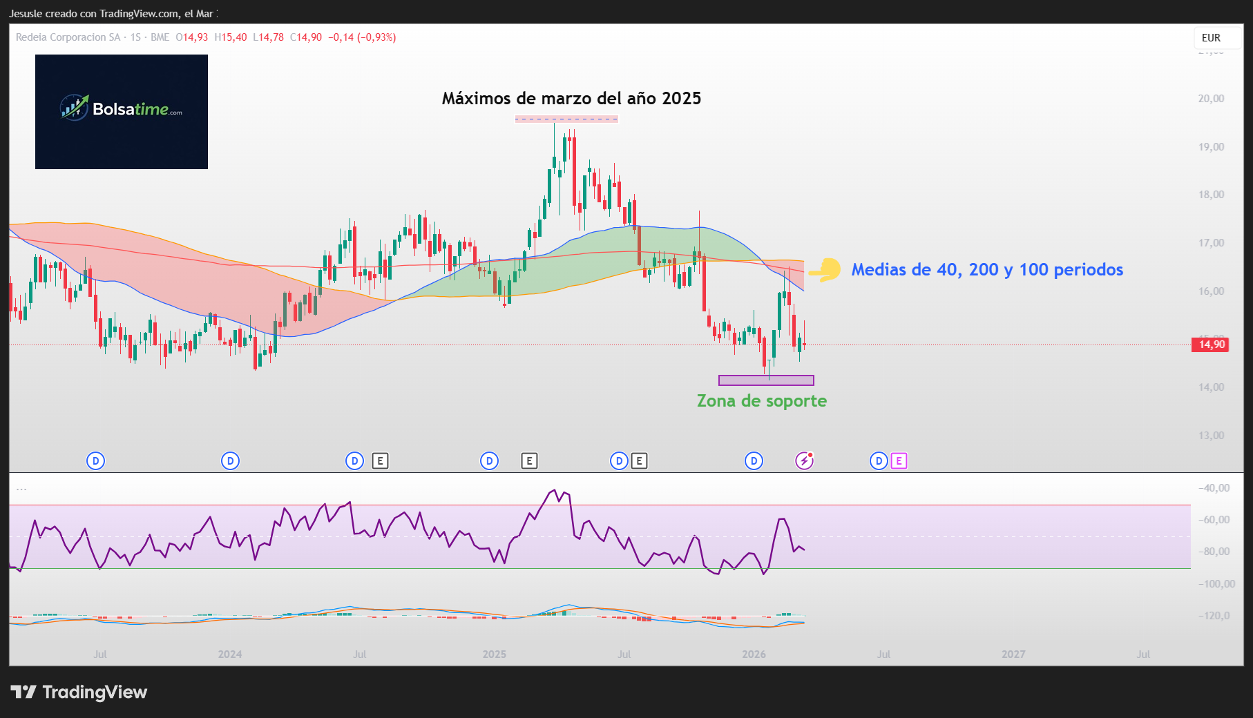 Por la parte de arriba, nos vamos a fijar en el nivel de los 15,50 €. Si fuera capaz de buscarlo para situarse por encima, nos indicaría que podría seguir recuperando posiciones en el corto plazo y mirar hacia la zona de los 16,05 €. Esa zona es muy importante sobre Redeia, y es que por ahí vamos a tener pasando la media de 40 períodos en gráfico semanal. El precio viene por debajo desde el mes de julio del año 2025, por lo que nos debería hacer de fuerte resistencia a su visita.