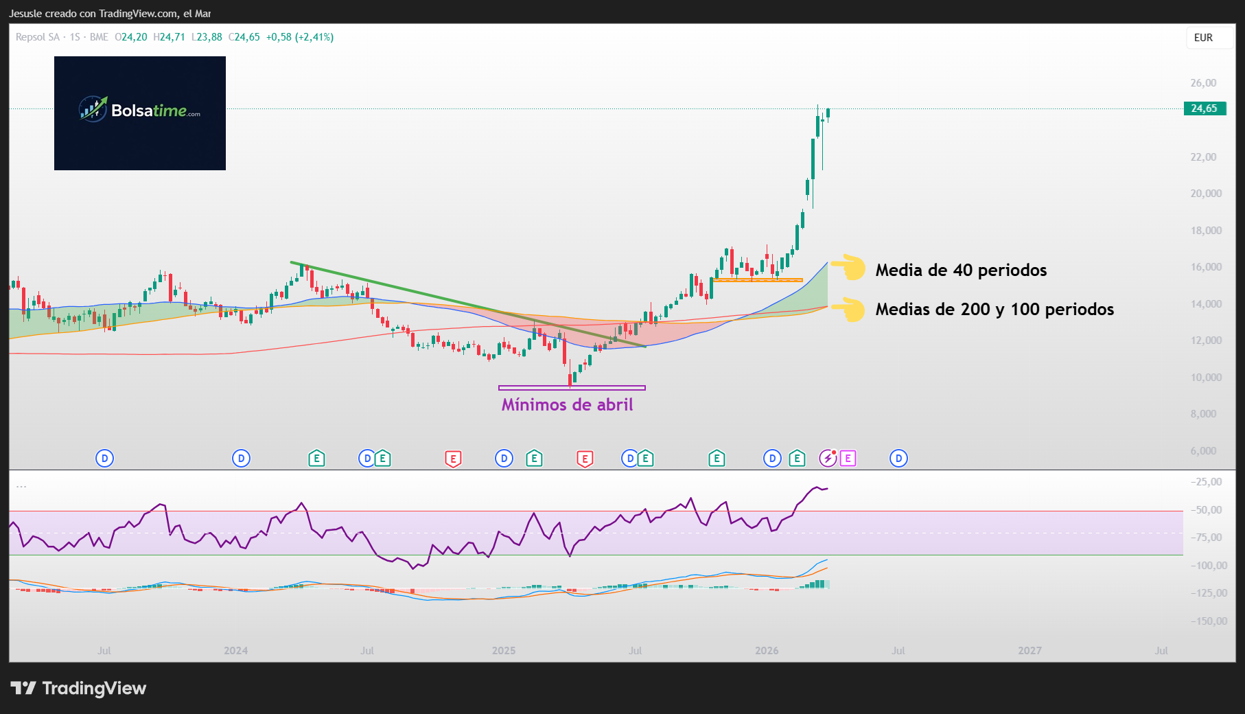 Comentaros que para buscar la media de 40 períodos en gráfico semanal tendremos que mirar más abajo, ya que ahora mismo pasa sobre los 14,70 €. No hay indicios de que vaya a buscarla de nuevo, pero ya sabéis que lo vamos a dejar a un lado e iremos viendo muy bien que va sucediendo sesión tras sesión sobre la compañía Repsol.