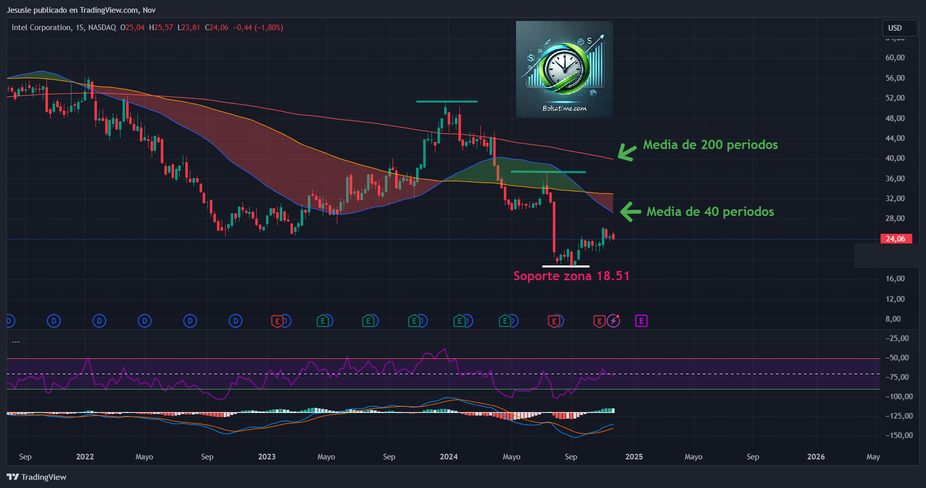 En cuanto a los soportes sobre Intel, no deberíamos ver que marca una perdida de la zona de los 18.51 dólares, ya que ese movimiento haría activar de nuevo debilidad, rompiendo los mínimos del pasado mes de septiembre de este año 2024 y debería continuar perdiendo posiciones con un nuevo objetivo bajista sobre la zona de los 18 dólares por acción.